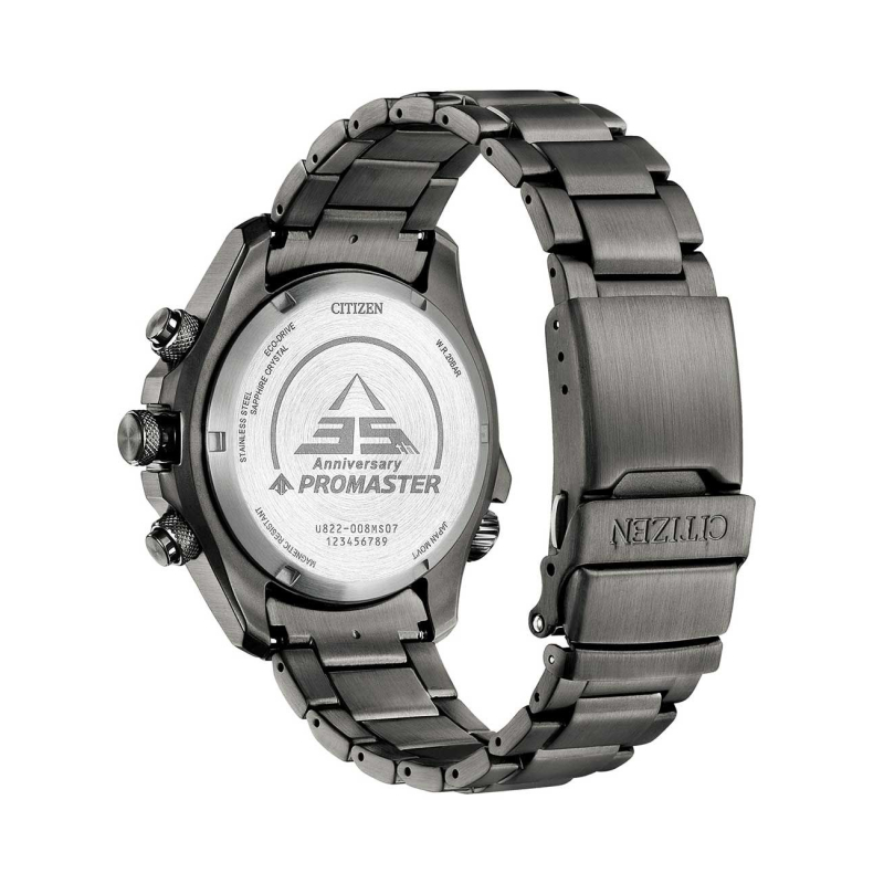 Citizen-Herrenuhr aus der Promaster Land U822 Limited Edition-Kollektion. Das Uhrwerk der Uhr ist ein Ecodrive-Quarzwerk (solarbetrieben). Das Gehäuse ist aus grauem IP-Stahl, Durchmesser 44 mm. Das Armband ist aus grauem IP-Stahl. Das Glas besteht aus Saphirglas mit Antireflexionsbehandlung. Das Zifferblatt ist tarnfarben und verfügt über eine Digitalanzeige. Die Wasserdichtigkeit beträgt 20 bar / 200 Meter. Referenz: JV1008-63E