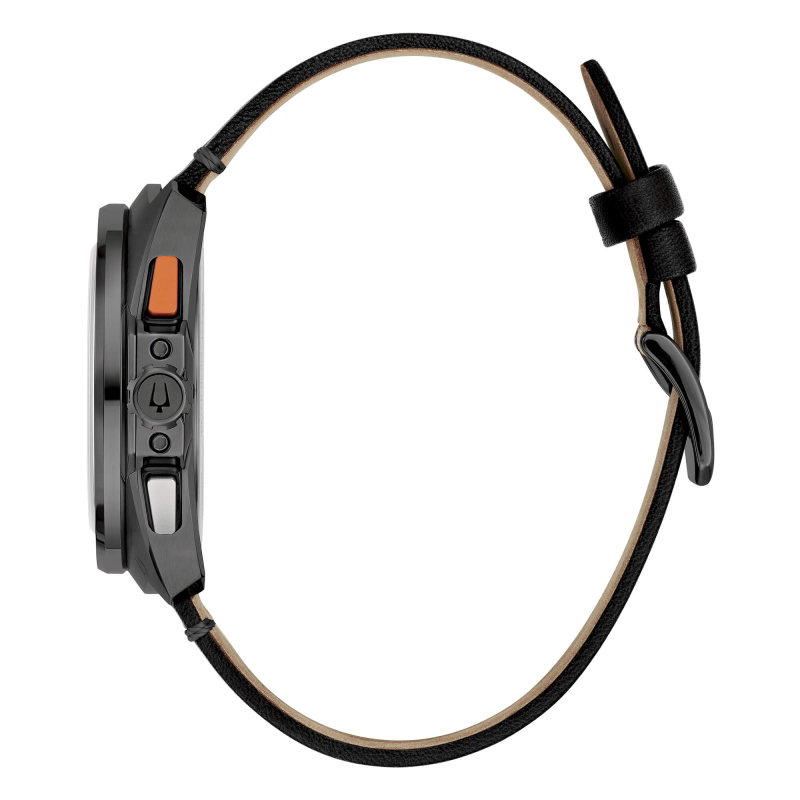 Bulova Herrenuhr aus der Racer-Kollektion. Das Uhrwerk ist ein Quarzwerk mit Datums-, Chronographen- und 24-Stunden-Tagesanzeigefunktionen. Das Gehäuse besteht aus schwarzem IP-Stahl und hat einen Durchmesser von 42 mm. Das Armband ist aus schwarzem Leder. Das Zifferblatt ist schwarz. Saphirglas. Die Wasserdichtigkeit beträgt 10 bar / 100 Meter. Referenz: 98B428
