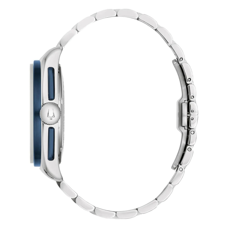 Bulova Herrenuhr aus der Lunar Pilot Kollektion. Die Uhr verfügt über ein Quarzwerk mit Chronographenfunktion. Das Gehäuse ist aus Edelstahl mit einem Durchmesser von 43,5 mm. Das Armband ist ebenfalls aus Edelstahl. Das Zifferblatt ist blau. Saphirglas. Die Wasserdichtigkeit beträgt 5 Bar / 50 Meter. Referenz: 98A329