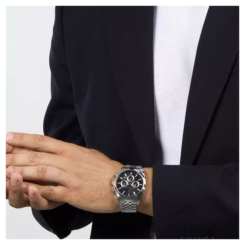 Maserati Herrenuhr aus der Attrazione Kollektion. Die Uhr verfügt über ein Quarzwerk mit Datums-, Chronographen- und 24-Stunden-Anzeige. Das Gehäuse ist aus Edelstahl und hat einen Durchmesser von 43 mm. Das Armband ist ebenfalls aus Edelstahl. Das Zifferblatt ist schwarz. Wasserdicht bis 5 ATM / 50 Meter. Referenznummer: R8853151022