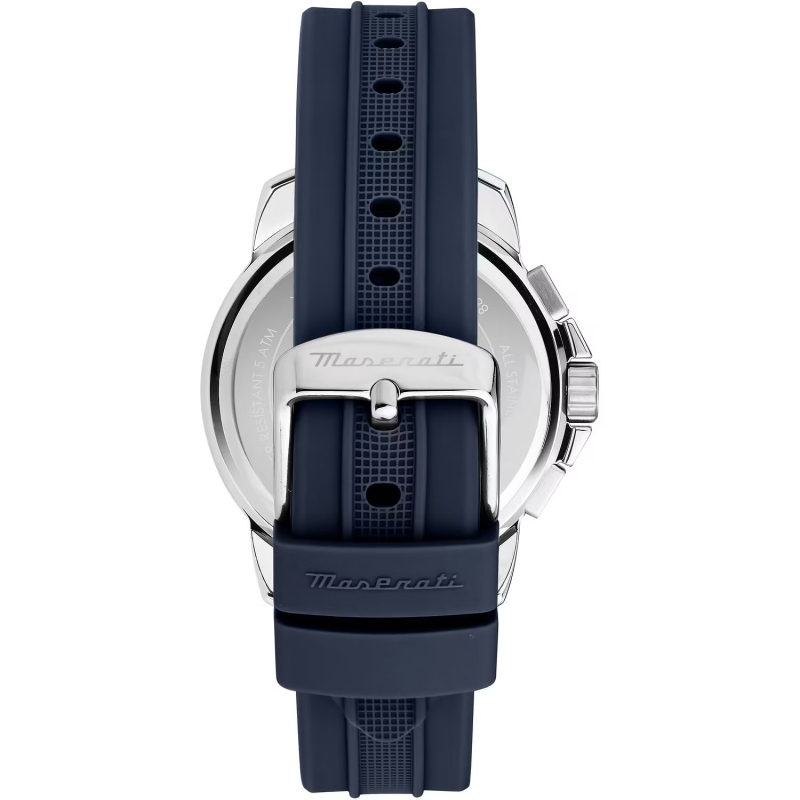 Maserati Herrenuhr aus der Successo Kollektion. Die Uhr verfügt über ein Quarzwerk mit Datums- und Chronographenfunktion. Das Gehäuse ist aus Edelstahl und hat einen Durchmesser von 42 mm. Das Armband ist aus blauem Silikon. Das Zifferblatt ist silberfarben. Wasserdicht bis 5 ATM / 50 Meter. Referenznummer: R8871621042