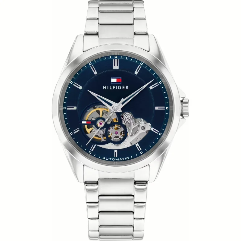 Tommy Hilfiger Herrenuhr aus der Baker Kollektion. Die Uhr verfügt über ein mechanisches Uhrwerk mit automatischem Aufzug. Das Gehäuse ist aus Edelstahl gefertigt und hat einen Durchmesser von 39 mm. Das Armband ist ebenfalls aus Edelstahl. Das Zifferblatt ist blau. Wasserdicht bis 3 ATM / 30 Meter. Referenznummer: 1710716