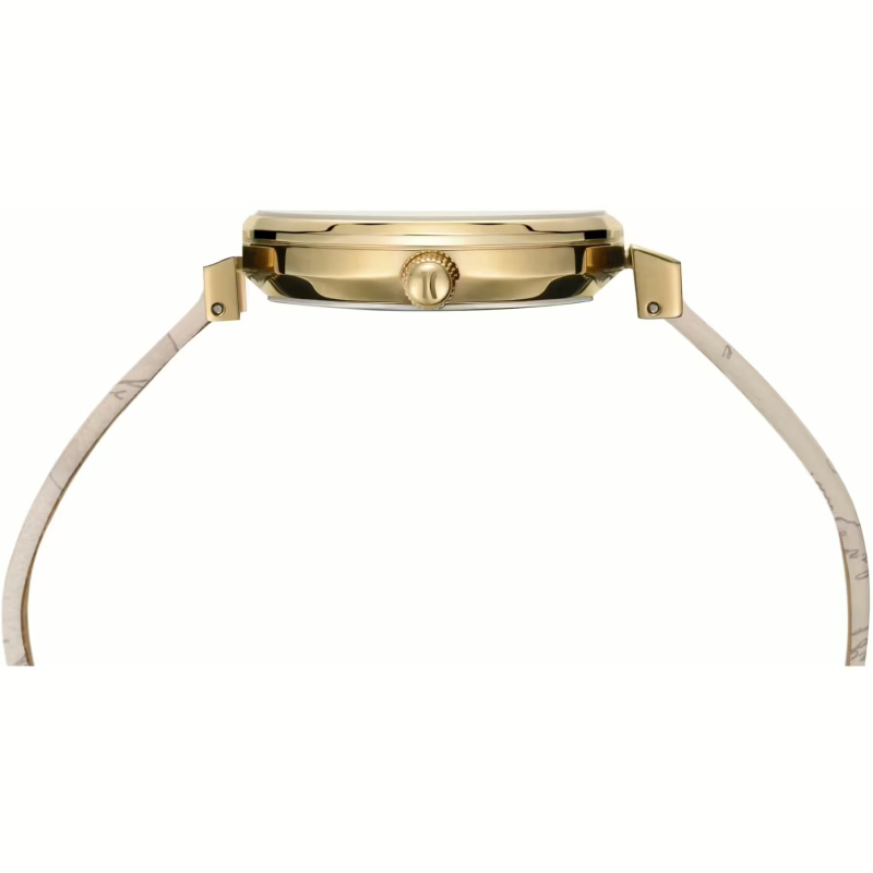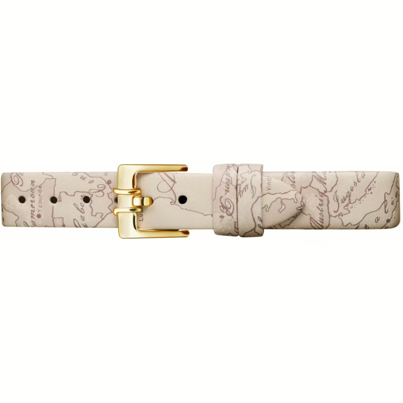 Alviero Martini 1a Classe Damenuhr aus der Montecarlo Kollektion. Die Uhr verfügt über ein Quarzwerk. Das Gehäuse ist aus goldfarbenem PVD-beschichtetem Edelstahl gefertigt und hat einen Durchmesser von 32 mm. Das Armband besteht aus Leder mit einem Geo-Map-Print. Das Zifferblatt ist rosa. Wasserdicht bis 3 ATM / 30 Meter. Referenz: AC00060010201S01