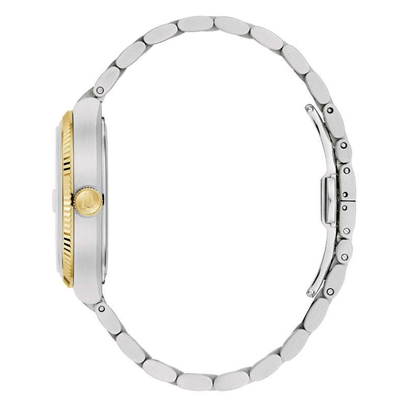 Bulova Herrenuhr aus der Super Seville Kollektion. Die Uhr verfügt über ein hochpräzises Quarzwerk mit Datumsanzeige. Das Gehäuse besteht aus Edelstahl und goldfarbenem PVD-beschichtetem Edelstahl und hat einen Durchmesser von 38 mm. Das Armband ist ebenfalls aus Edelstahl und goldfarbenem PVD-beschichtetem Edelstahl gefertigt. Das Zifferblatt ist schwarz. Saphirglas. Wasserdicht bis 3 ATM / 30 Meter. Referenznummer: 98B458