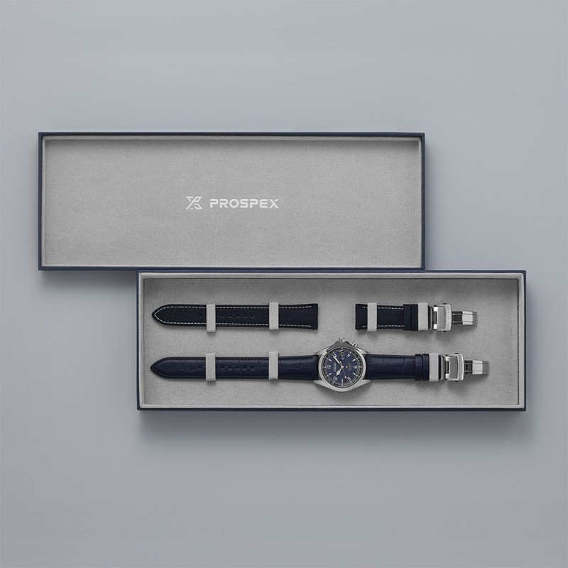 Seiko Herrenuhr aus der Prospex Kollektion. Die Uhr verfügt über ein mechanisches Uhrwerk mit automatischem Aufzug (70 Stunden Gangreserve) und Datumsanzeige. Das Gehäuse ist aus Edelstahl und hat einen Durchmesser von 39,5 mm. Das Armband ist aus blauem Leder. Saphirglas. Das Zifferblatt ist blau. Wasserdicht bis 20 bar / 200 Meter. Referenz: SPB531J1