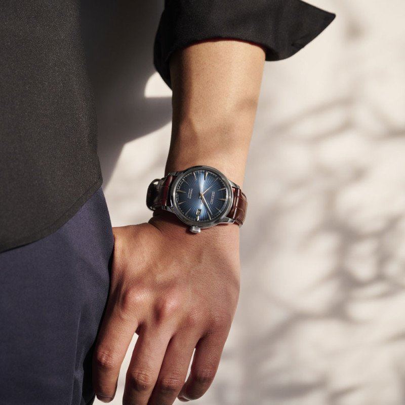 Die Uhren der Presage Cocktail Kollektion sind dank ihres Sonnenschliff-Zifferblatts leicht zu erkennen und ihre elegante Schlichtheit entspricht perfekt der japanischen Tradition. Das blaue Zifferblatt dieses Modells ist von der Farbe des Cocktails Blue Moon inspiriert. Zusammen mit einem braunen Lederarmband sorgt diese Automatikuhr für einen eleganten und zugleich komfortablen Look und ist somit für jeden Anlass geeignet.