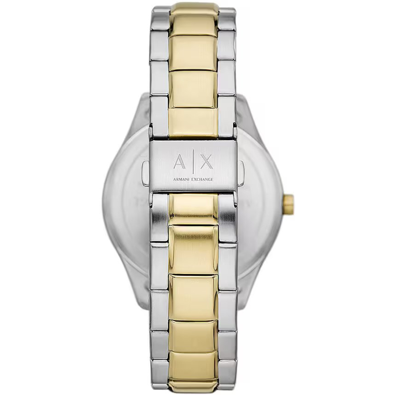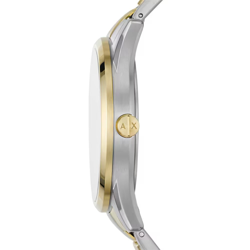 Armani Exchange Herrenuhr aus der Dante-Kollektion. Die Uhr verfügt über ein Quarzwerk mit Datums-, Wochentags- und 24-Stunden-Anzeige. Das Gehäuse besteht aus Edelstahl und goldfarbenem PVD-beschichtetem Edelstahl und hat einen Durchmesser von 44 mm. Das Armband ist ebenfalls aus Edelstahl und goldfarbenem PVD-beschichtetem Edelstahl gefertigt. Das Zifferblatt ist schwarz. Wasserdicht bis 5 ATM / 50 Meter. Referenznummer: AX1865