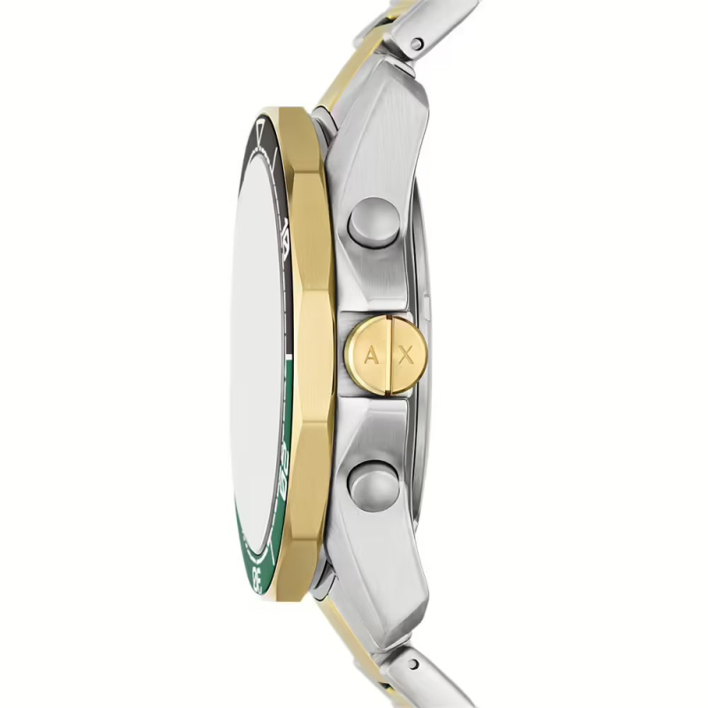 Armani Exchange Herrenuhr aus der Spencer Kollektion. Die Uhr verfügt über ein Quarzwerk mit Datums-, Chronographen- und 24-Stunden-Anzeige. Das Gehäuse besteht aus Edelstahl und goldfarbenem PVD-beschichtetem Edelstahl und hat einen Durchmesser von 44 mm. Das Armband ist ebenfalls aus Edelstahl und goldfarbenem PVD-beschichtetem Edelstahl gefertigt. Das Zifferblatt ist grün. Wasserdicht bis 10 ATM / 100 Meter. Referenznummer: AX1966