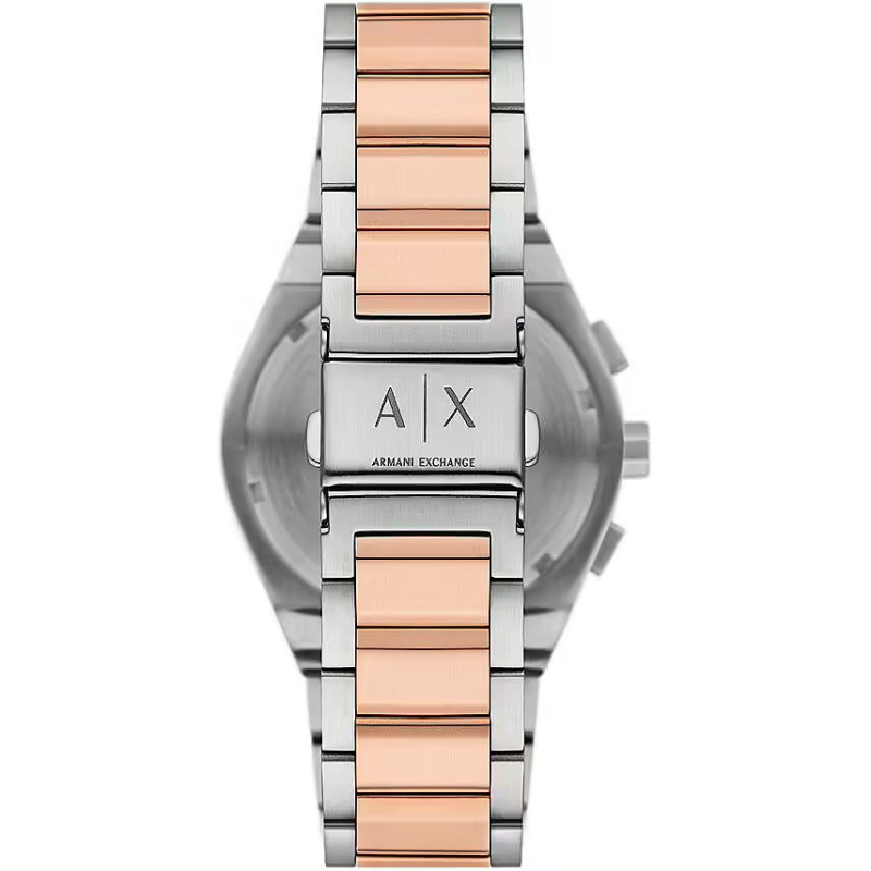 Das 42-mm-Edelstahlgehäuse harmoniert perfekt mit dem zweifarbigen, satinierten Stahlarmband und erzeugt so einen eleganten Kontrast zum schwarzen Zifferblatt und den roségoldenen Details. Diese Materialkombination verleiht dem Modell Charakter und Vielseitigkeit.