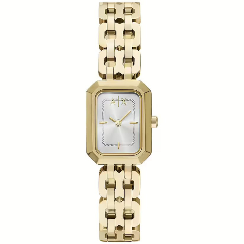 Das 27 mm große rechteckige Gehäuse aus goldfarbenem Edelstahl harmoniert perfekt mit dem goldfarbenen Stahlarmband mit schmalen Gliedern und Faltschließe. Das silberfarbene Zifferblatt mit Sonnenschliff sorgt für eine leuchtende und elegante Ästhetik und passt ideal zu lässig-schicken oder formelleren Outfits.
