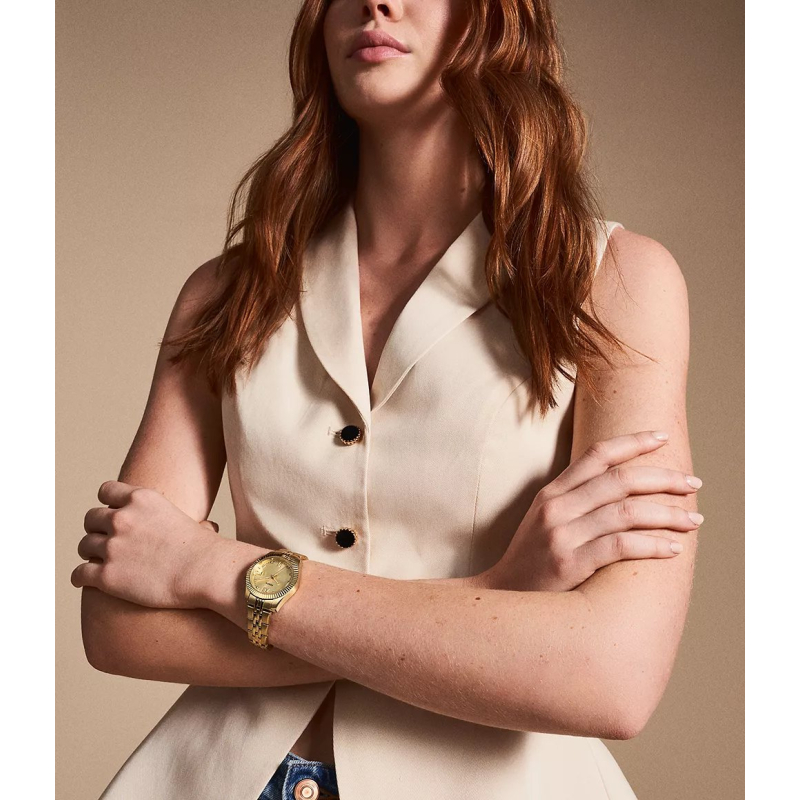 Die Fossil Scarlette Uhr besticht durch ihre strahlende Eleganz und edel-raffinierte Optik. Goldene Akzente und ein stilvolles Design schmücken das Handgelenk und machen sie zur perfekten Ergänzung für jeden Tag.