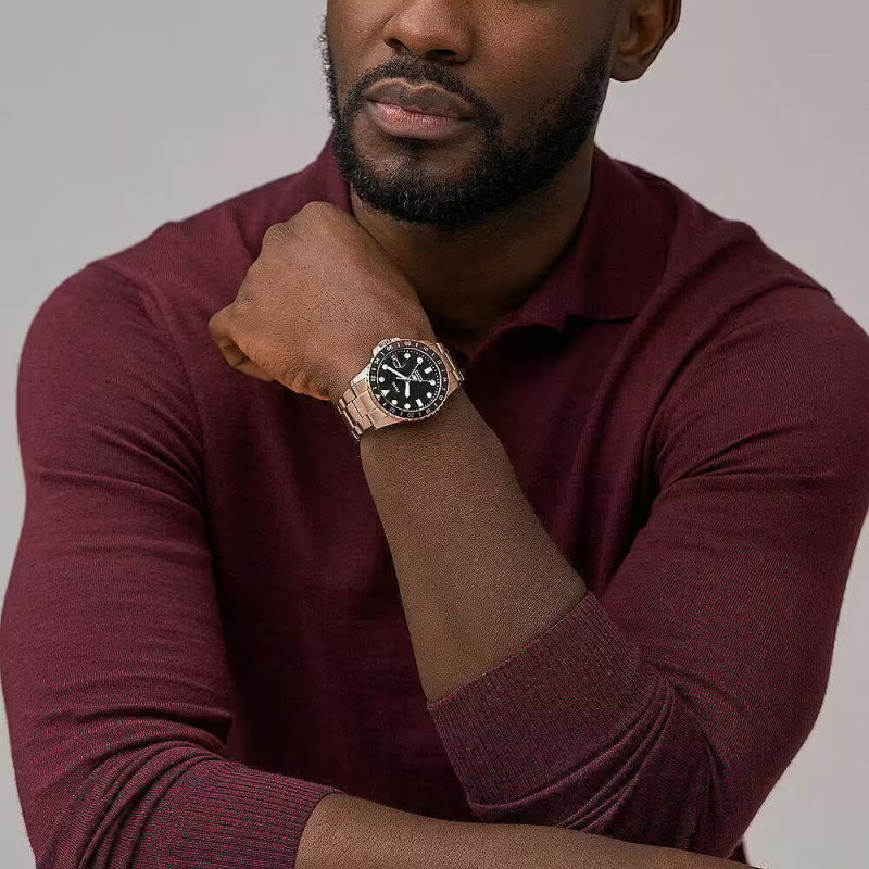 Fossil Blue GMT FS6027 : Roségoldfarbener PVD-beschichteter Edelstahl und schwarzes Zifferblatt für einen markanten, eleganten Look – perfekt für Stadt und Reisen. Mit GMT-Funktion zur Verwaltung einer zweiten Zeitzone begleitet Sie diese Uhr stilvoll durch Arbeit, Wochenenden und Abenteuer auf See.