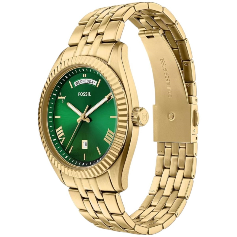 Fossil Campbell FS6142 : Das komplett goldfarbene PVD-beschichtete Gehäuse mit grünem Zifferblatt sorgt für einen markanten und zugleich raffinierten Look, der alle Blicke auf sich zieht. Ideal für besondere Anlässe und Abende – diese Uhr verleiht selbst schlichten Outfits mit ihrer modernen Eleganz das gewisse Etwas.
