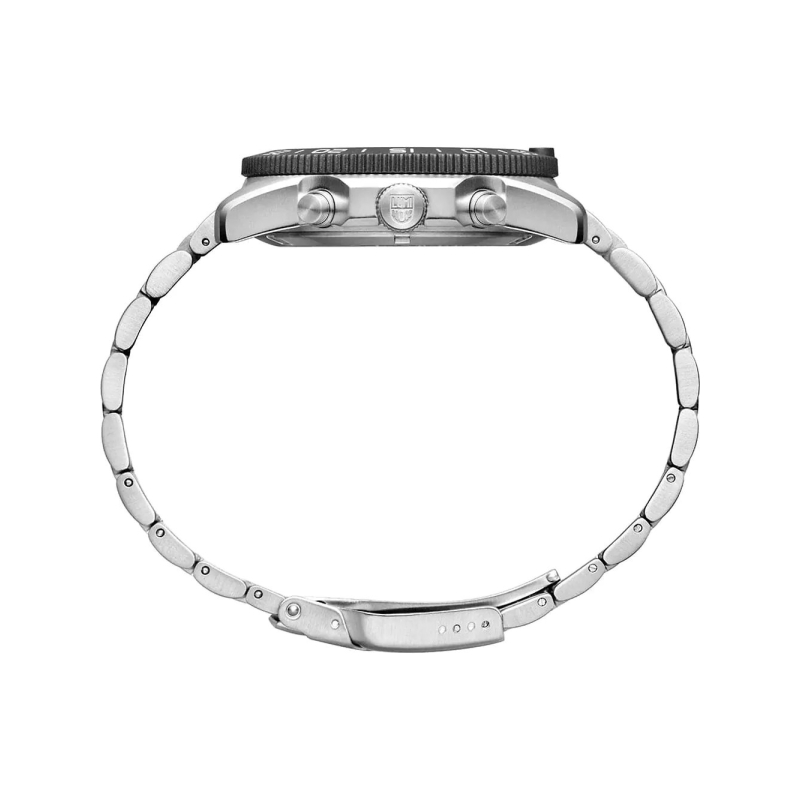 Luminox Herrenuhr aus der Pacific Diver Kollektion. Die Uhr verfügt über ein Schweizer Quarzwerk mit Datums- und Chronographenfunktion. Das Gehäuse ist aus Edelstahl gefertigt und hat einen Durchmesser von 44 mm. Das Armband ist ebenfalls aus Edelstahl. Entspiegeltes Saphirglas. Das Zifferblatt ist schwarz. Wasserdicht bis 20 ATM / 200 Meter. Referenz: XS.3142