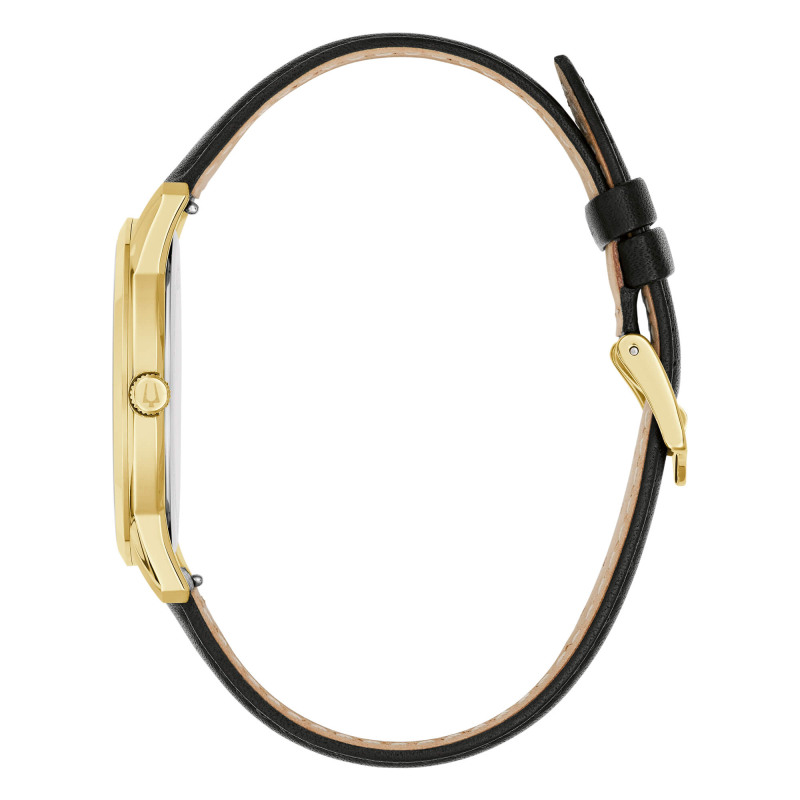 Bulova Sutton 97B238 : Gold, silbernes Zifferblatt und schwarzes Lederarmband – klassische Eleganz mit warmem und raffiniertem Charme. Perfekt für Beruf, Events und besondere Abende, verleiht sie jedem Outfit mühelos eine unverwechselbare Note.