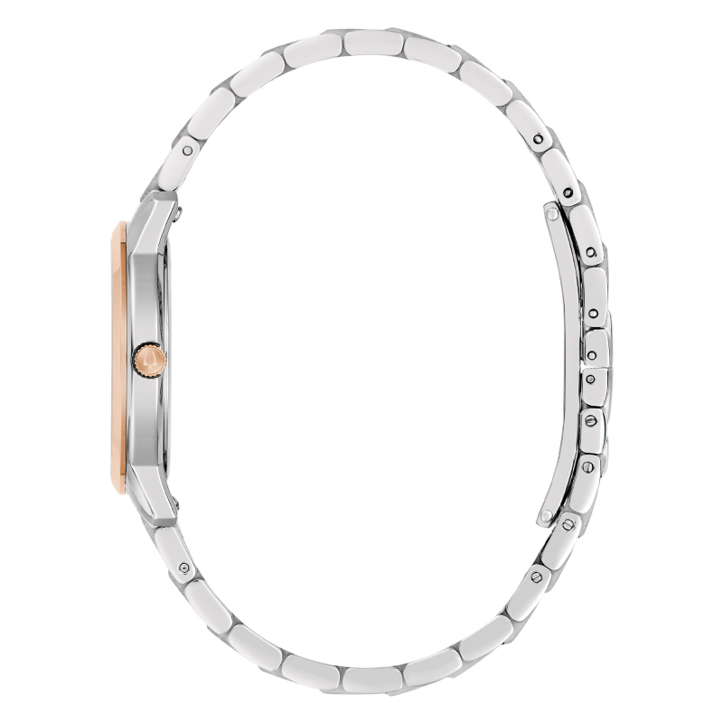 Bulova Sutton 98M140 : Edelstahl und roségoldene PVD-Beschichtung mit silbernem Zifferblatt für feminine, strahlende und raffinierte Eleganz. Perfekt für den Alltag oder besondere Anlässe – sie verleiht jedem Outfit einen Hauch von Chic.