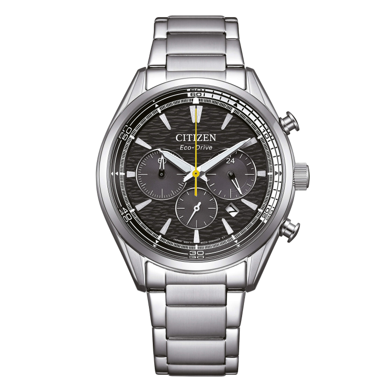 Citizen Herrenuhr aus der OF Sport Chrono Kollektion. Die Uhr verfügt über ein Eco-Drive Quarzwerk (solarbetrieben, 270 Tage Gangreserve) mit Datums-, Chronographen- und 24-Stunden-Anzeige. Das Gehäuse ist aus Edelstahl, Durchmesser 43 mm. Das Armband ist ebenfalls aus Edelstahl. Das Zifferblatt ist schwarz. Wasserdicht bis 10 bar (100 Meter). Referenz: CA4700-50E