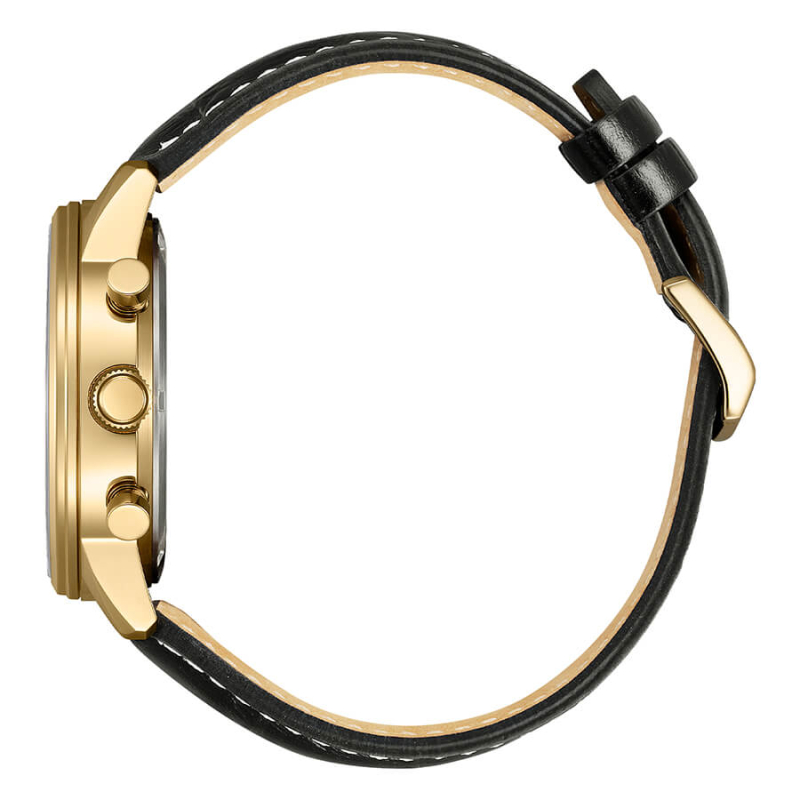 Citizen Herrenuhr aus der OF Aviator Chrono Kollektion. Die Uhr verfügt über ein Eco-Drive Quarzwerk (solarbetrieben, 270 Tage Gangreserve) mit Datums-, Chronographen- und 24-Stunden-Anzeige. Das 42 mm große Gehäuse aus goldfarbenem PVD-beschichtetem Edelstahl ist mit einem schwarzen Lederarmband versehen. Das Zifferblatt ist silberfarben. Wasserdicht bis 10 bar (100 Meter). Referenz: CA4723-03A