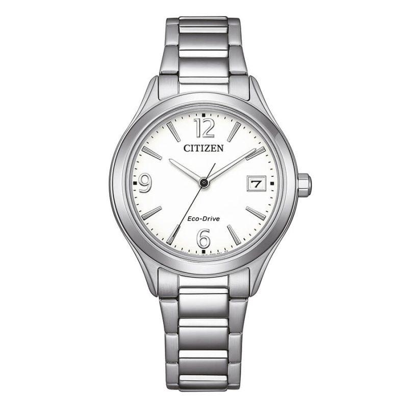 Damenuhr von Citizen aus der OF-Kollektion. Die Uhr verfügt über ein Eco-Drive-Quarzwerk (solarbetrieben, 240 Tage Gangreserve) mit Datumsanzeige. Das Gehäuse ist aus Edelstahl, Durchmesser 33,5 mm. Das Armband ist ebenfalls aus Edelstahl. Das Zifferblatt ist weiß. Wasserdicht bis 5 bar / 50 Meter. Referenznummer: FE6121-67A