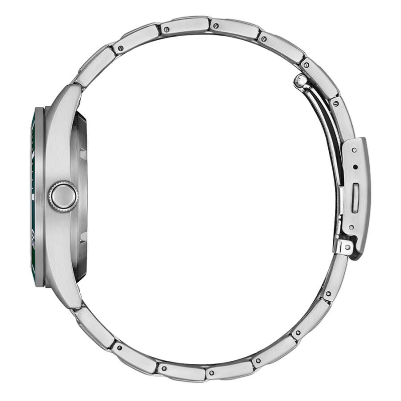 Citizen Herrenuhr aus der Meccanico Kollektion. Die Uhr verfügt über ein mechanisches Uhrwerk mit automatischem Aufzug und Datumsanzeige. Das Gehäuse ist aus Edelstahl gefertigt und hat einen Durchmesser von 38,5 mm. Das Armband ist ebenfalls aus Edelstahl. Das Zifferblatt ist grün. Wasserdicht bis 10 bar / 100 Meter. Referenznummer: NJ0220-52X