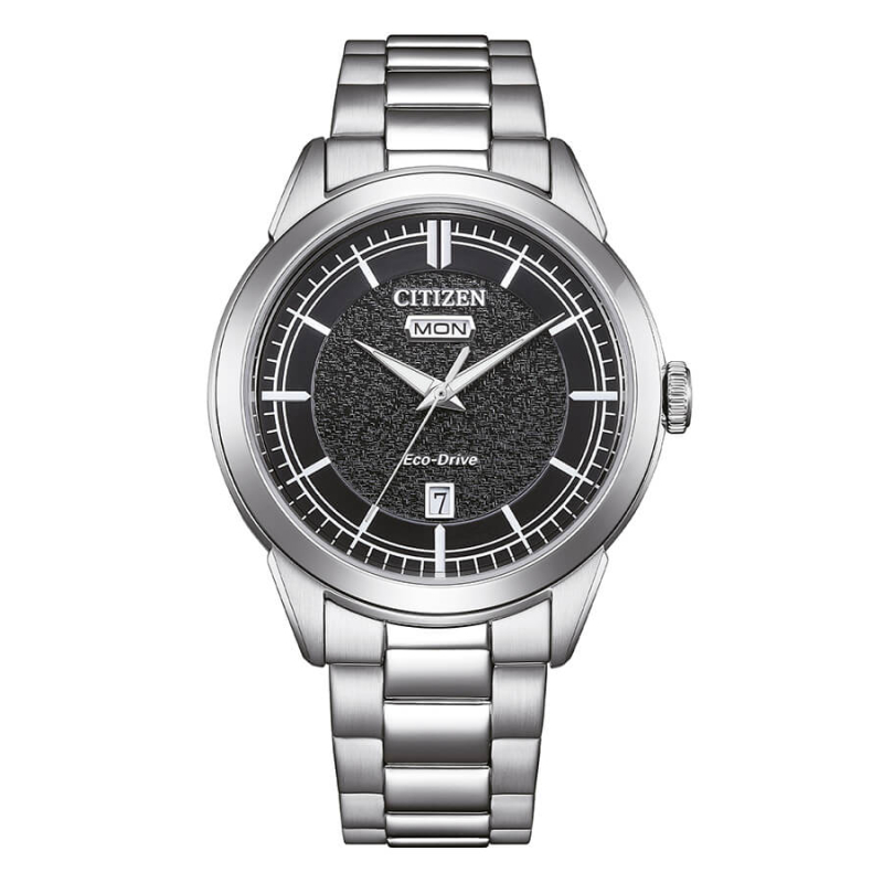 Citizen Herrenuhr aus der OF Day Date Kollektion. Die Uhr verfügt über ein Eco-Drive Quarzwerk (solarbetrieben, 240 Tage Gangreserve) mit Datums- und Wochentagsanzeige. Das Gehäuse ist aus Edelstahl gefertigt und hat einen Durchmesser von 40 mm. Das Armband ist ebenfalls aus Edelstahl. Das Zifferblatt ist schwarz. Wasserdicht bis 10 bar / 100 Meter. Referenz: AW0151-85E
