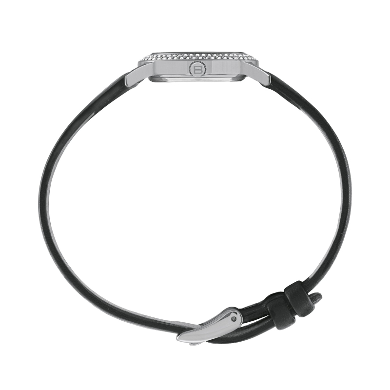 Breil Alvea TW2136 : Ein gebürstetes silbernes Zifferblatt und eine mit Kristallen besetzte Lünette verleihen der Uhr eine raffinierte Eleganz. Ein schwarzes Armband aus Leder und Seide rundet das Design ab. Perfekt für elegante Looks und besondere Anlässe.