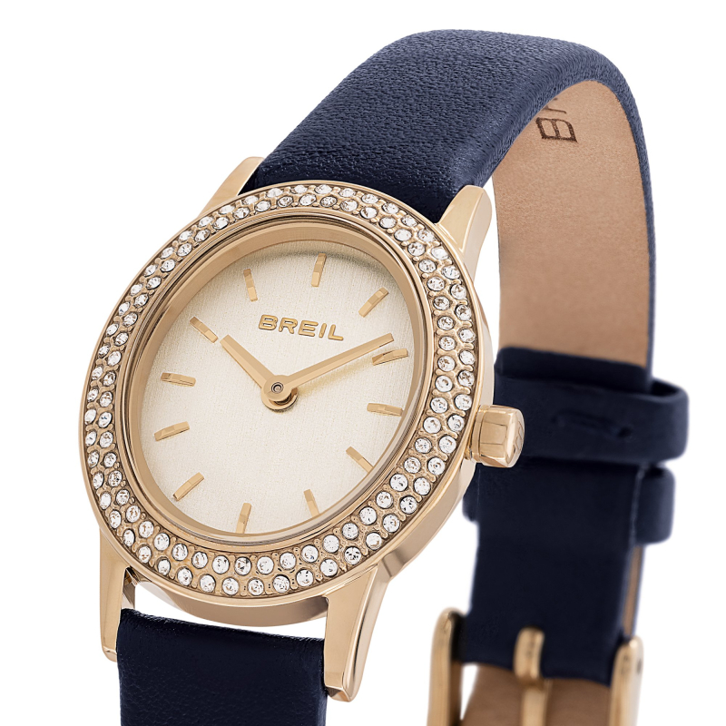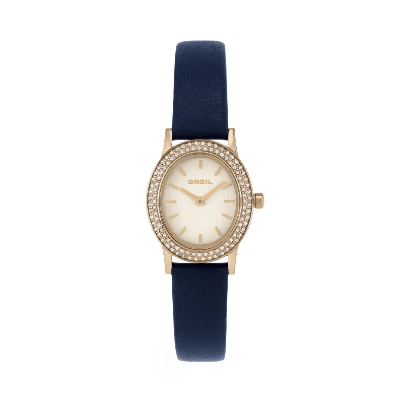 Breil Alvea TW2137 : Ein gebürstetes Goldzifferblatt und eine mit Kristallen besetzte Lünette verleihen der Uhr eine raffinierte Eleganz. Ein blaues Leder-Seidenarmband rundet das Design ab. Perfekt für elegante Looks und besondere Anlässe.