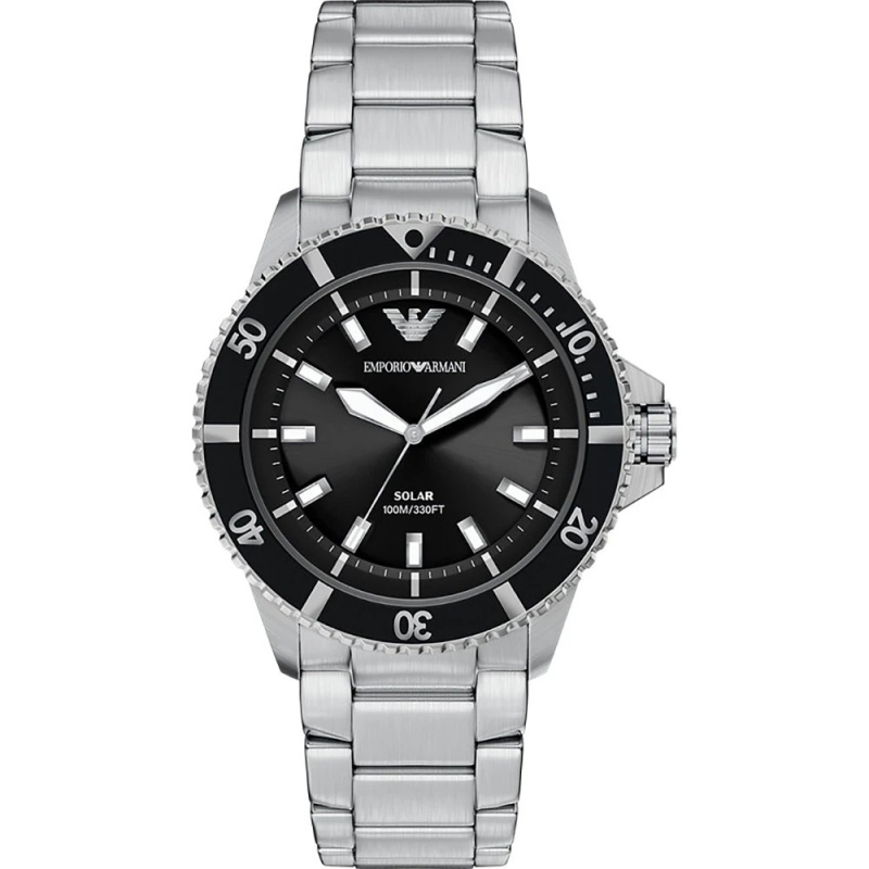 Emporio Armani Herrenuhr. Die Uhr verfügt über ein solarbetriebenes Quarzwerk. Das Gehäuse ist aus Edelstahl gefertigt und hat einen Durchmesser von 42 mm. Das Armband ist ebenfalls aus Edelstahl. Das Zifferblatt ist schwarz. Wasserdicht bis 10 ATM / 100 Meter. Referenznummer: AR11787