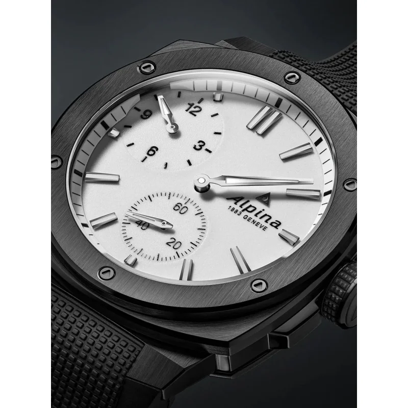 Alpina Herrenuhr aus der Alpiner Kollektion. Die Uhr verfügt über ein mechanisches Uhrwerk mit automatischem Aufzug (Kaliber AL-650, 38 Stunden Gangreserve, Frequenz 28.800 A/h). Das Gehäuse ist aus schwarzem IP-beschichtetem Stahl gefertigt und hat einen Durchmesser von 41 mm. Das Armband ist aus schwarzem Kautschuk. Das Zifferblatt ist weiß. Wasserdicht bis 20 ATM / 200 Meter. Referenz: AL-650LGBLL4AEBDLC