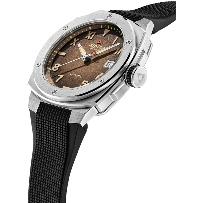 Alpina Herrenuhr aus der Alpiner Kollektion. Die Uhr verfügt über ein mechanisches Uhrwerk mit automatischem Aufzug (Kaliber AL-525, 38 Stunden Gangreserve, Frequenz 28.800 A/h) und Datumsanzeige. Das Gehäuse ist aus Edelstahl und hat einen Durchmesser von 39 mm. Das Armband ist aus schwarzem Kautschuk. Das Zifferblatt ist braun. Wasserdicht bis 20 ATM / 200 Meter. Referenz: AL-525BRG3AE6