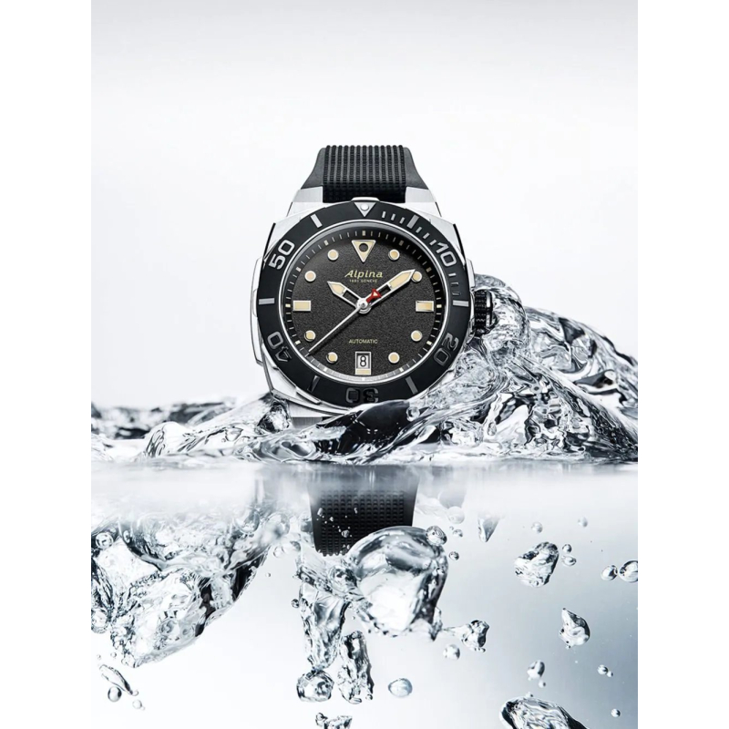 Alpina Herrenuhr aus der Seastrong Kollektion. Die Uhr verfügt über ein mechanisches Uhrwerk mit automatischem Aufzug (Kaliber AL-520, 38 Stunden Gangreserve, Frequenz 28.800 A/h) und Datumsanzeige. Das Gehäuse ist aus Edelstahl, Durchmesser 39 mm. Das Armband ist aus schwarzem Kautschuk. Das Zifferblatt ist schwarz. Wasserdicht bis 30 ATM / 300 Meter. Referenz: AL-525B3VE6