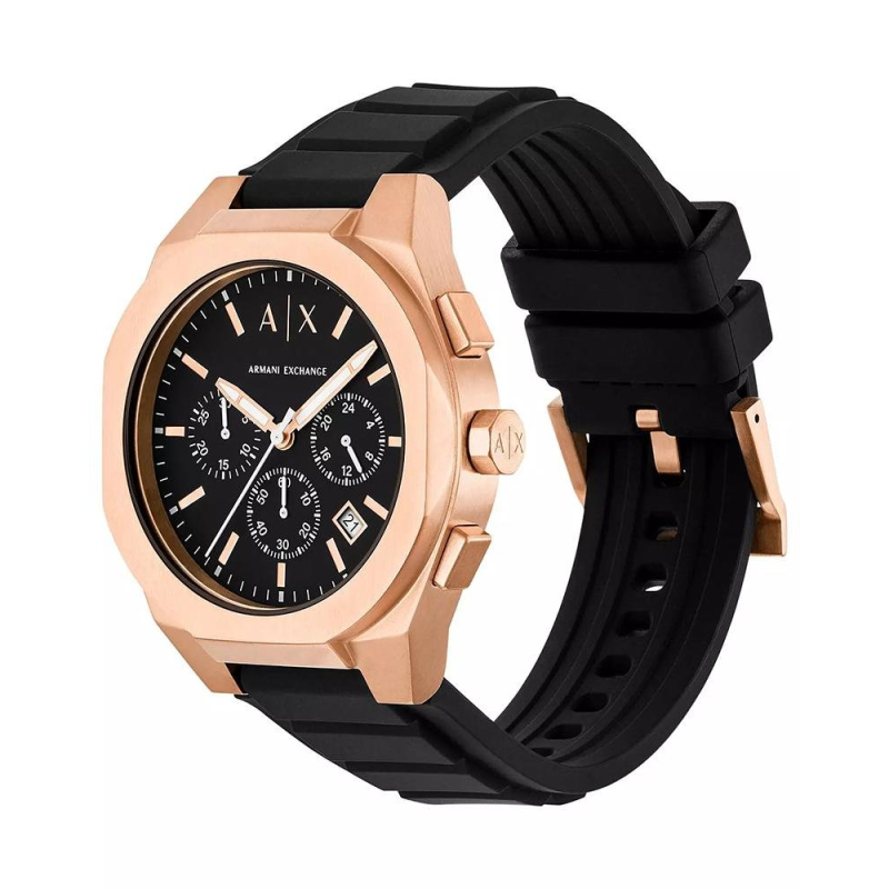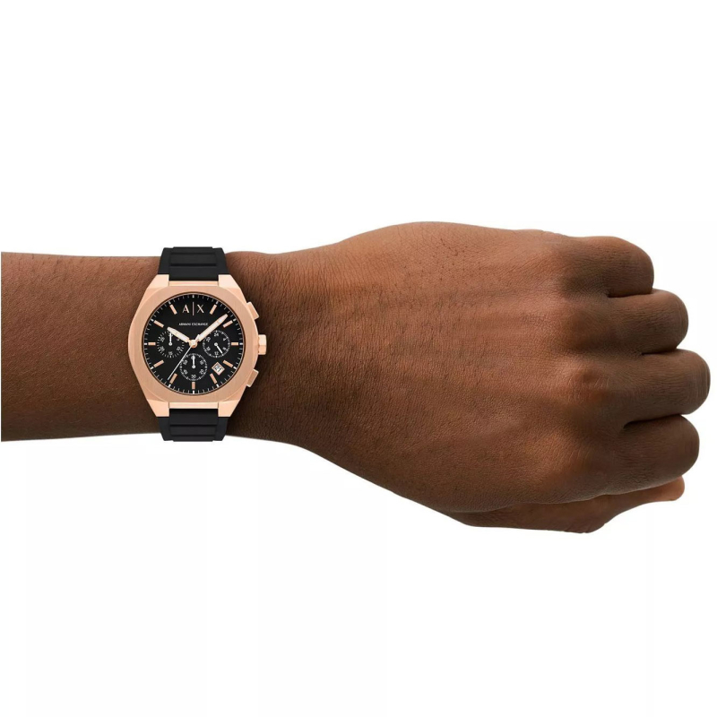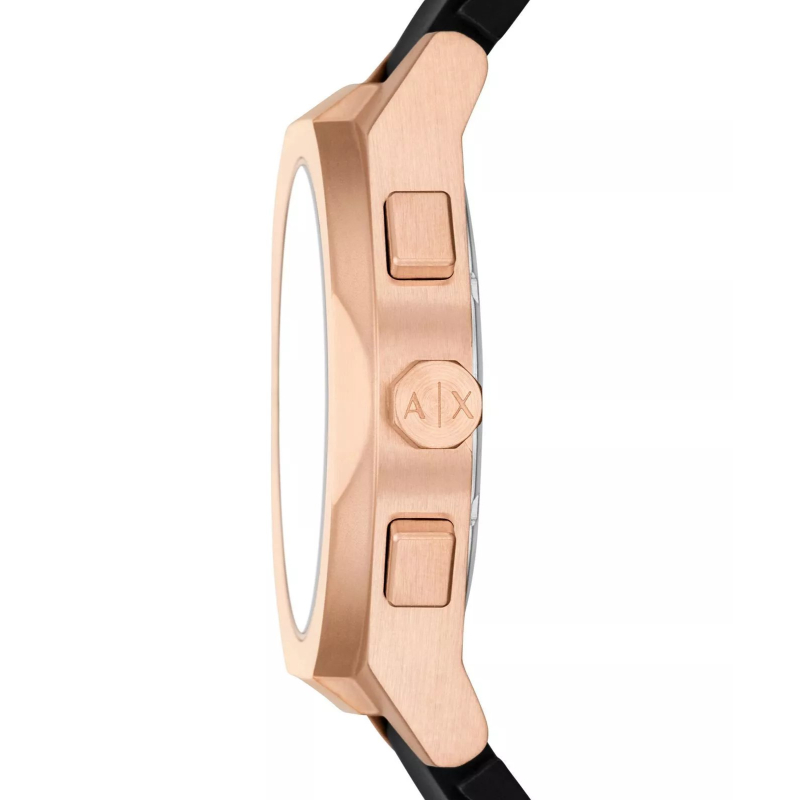 Armani Exchange Sync AX4190 : Roségoldfarbener PVD-beschichteter Stahl und komplett schwarzes Design für einen sportlich-modernen und eleganten Look. Perfekt für Freizeit, Wochenenden und entspannte Abende – diese Uhr verleiht jedem Outfit Charakter und Stil.
