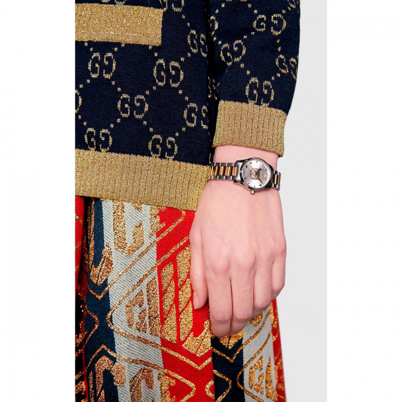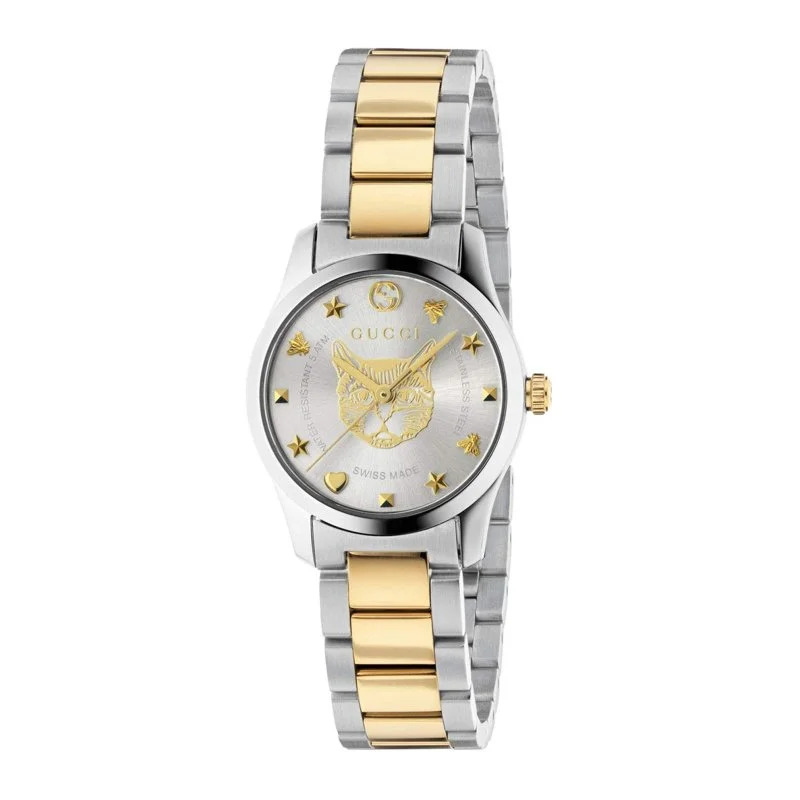 Gucci Damenuhr aus der G-Timeless Kollektion. Schweizer Quarzwerk. Gehäusedurchmesser 27 mm aus Stahl mit goldener Lünette. Armband aus Stahl in Silber- und Goldfarbe. Silbernes Zifferblatt mit gelbgoldenem Katzenkopfmotiv. Die Wasserdichtigkeit beträgt 3 ATM. Referenz: YA126596