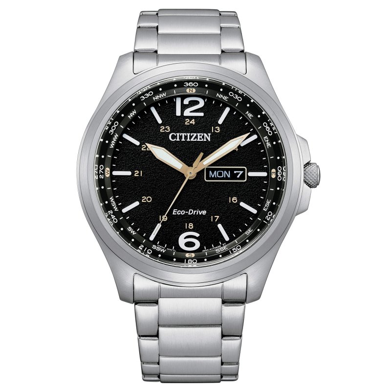 Citizen Herrenuhr aus der Military Kollektion. Das Uhrwerk der Uhr ist ein Eco-Drive-Quarzwerk mit Datumsfunktionen und Wochentagsanzeige. Das Gehäuse mit 44 mm Durchmesser besteht aus Stahl. Das Armband ist aus Stahl. Das Zifferblatt ist schwarz mit einer Mondoberflächenstruktur. Die Wasserdichtigkeit beträgt 10 atm / 100 Meter. Referenz: AW0110-82E