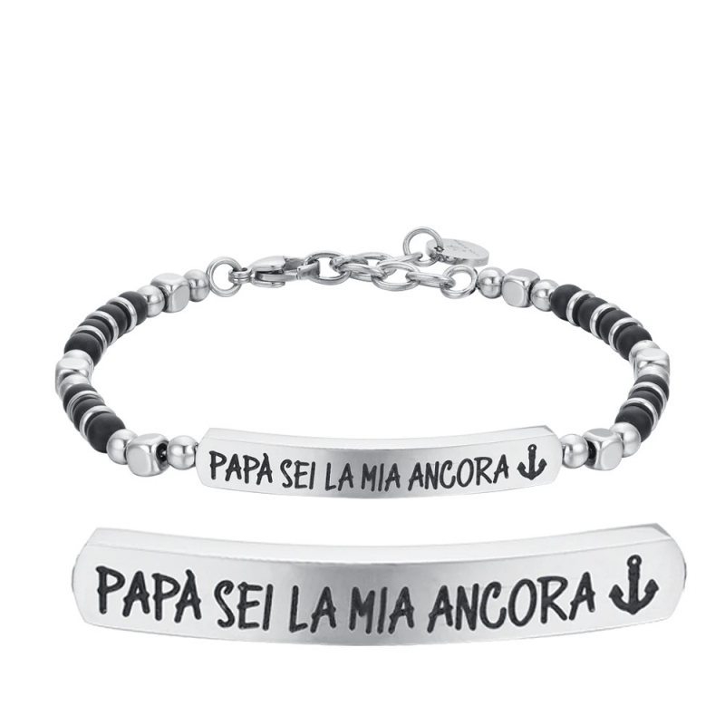 Men's steel bracelet with black agate stones and plate Daddy you are my anchor. Length: 19 + 3 cm. Plate size: 40 x 6 mm. Stone size: 4 mm. Chain thickness: 6 mm. The plate engraved with the affectionate dedication Dad, You Are My Again makes this bracelet an extraordinary gift, a symbol of the strong and unshakable bond between father and son. The black agate stones add a touch of elegance and meaning to the overall design. Reference: BA1718