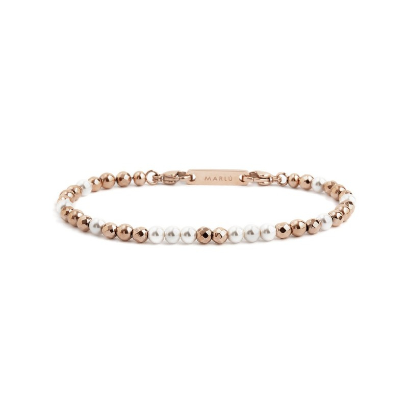 Bracelet with white pearls, mirrored hematite elements, alternating with polished steel elements. Total length 19 cm, adjustable from 19 cm 17.5 mm via removable steel Marlù logo tag. Reference: 2BR0081R-W