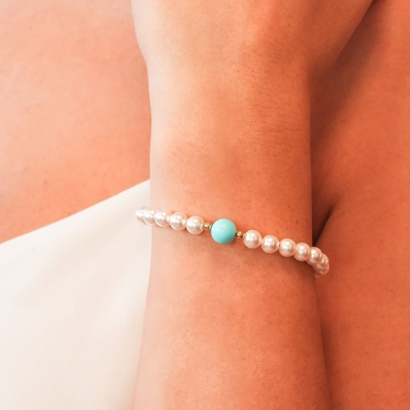 Bottega Boccadamo women's bracelet from the Perla collection. 925 silver PVD gold bracelet with a strand of medium pearls, beads, and a central turquoise. Adjustable length from 17.5 to 20.5 cm. Reference: BBR142DT