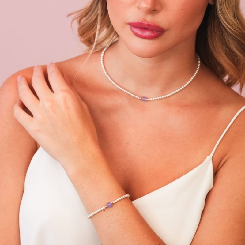 Bottega Boccadamo women's bracelet from the Perla collection. 925 silver PVD gold bracelet with a strand of small pearls, beads, and a central amethyst. Adjustable length from 16.5 to 20 cm. Reference: BBR143DV