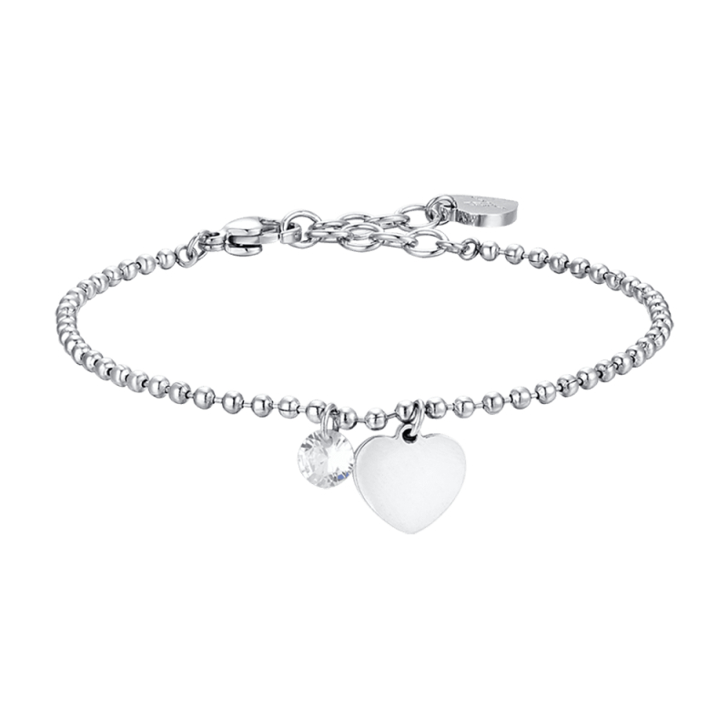 Women's steel bracelet with heart and white zirconia. Length 16 cm + 3 cm. Heart size 10 x 9 mm. Zirconia size 5 mm. This bracelet is a celebration of grace and femininity, perfect for those seeking an accessory that combines refined design and symbolic meaning. The heart, the center of this stunning piece, represents love, passion, and affection. It is embellished with a sparkling white crystal that elegantly catches the light and adds a touch of brightness to your look. Reference: BK2596