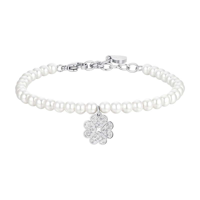 Women's steel bracelet with synthetic pearls and a four-leaf clover with white crystals. Length: 16.5 + 3 cm. Pearl size: 4 mm. Four-leaf clover size: 10 x 11 mm. Illuminate your wrist with the elegance and good fortune of this stunning steel bracelet. Featuring luminous pearls and a graceful four-leaf clover embellished with white crystals. The four-leaf clover, a traditional symbol of good luck, is enriched with sparkling white crystals, evoking light and positivity. Reference: BK2689