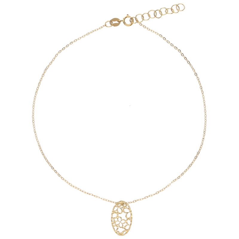 A jewel that enhances femininity with refinement . This women's anklet in 18kt yellow gold , embellished with an elegant openwork oval pendant , adds a touch of sparkle and style to every step. A precious detail designed for those who love the grace of details.
