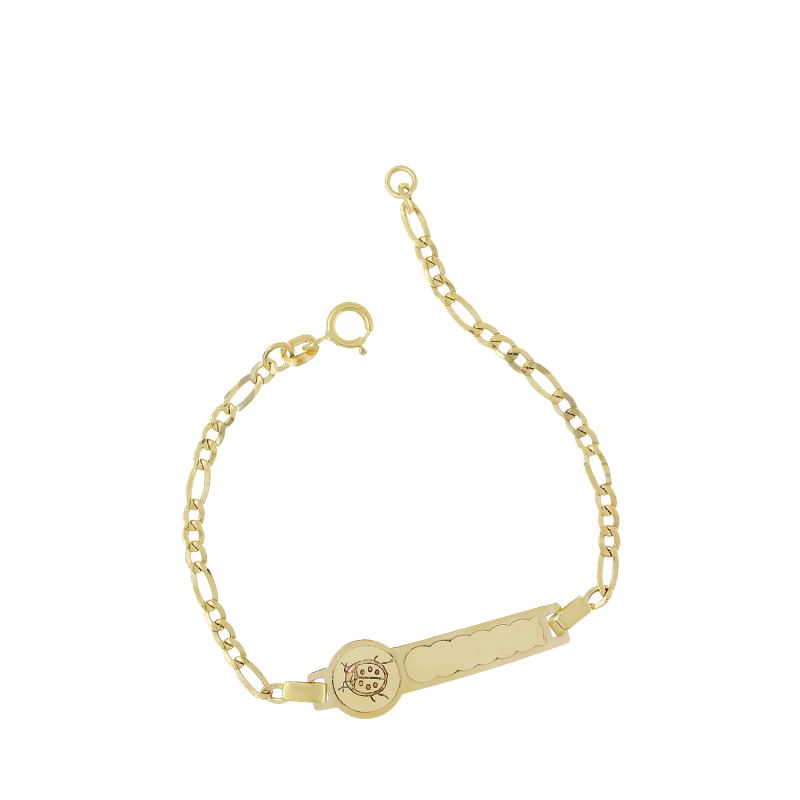 Children's bracelet in 18KT yellow gold. Chain bracelet with a customizable engraved tag and a laser-etched ladybug on the side. The bracelet length is 13 cm. The bracelet weighs 1.50 grams. Reference: GL102300