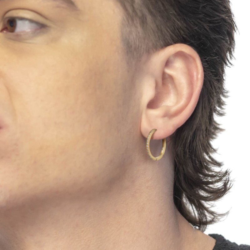 Single steel hoop earring, 24 mm in diameter, with cubic zirconia. Snap closure. Laser-etched Marlù logo on the side. Reference: 31OR0022G-W