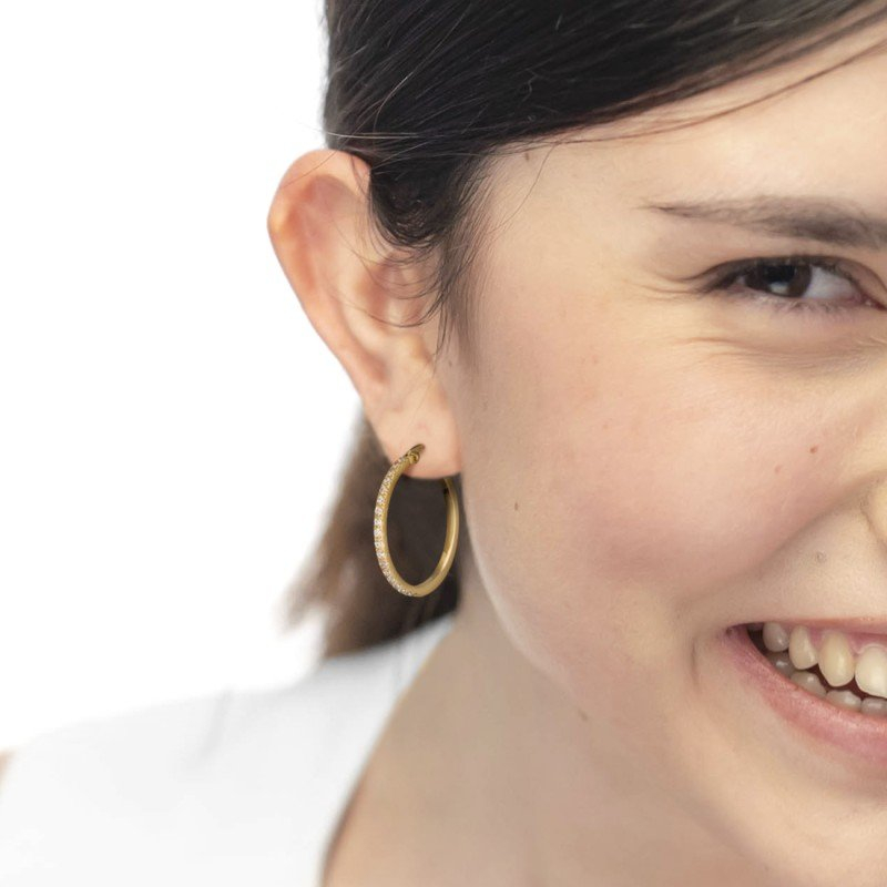 Single steel hoop earring, 29 mm in diameter, with cubic zirconia. Snap closure. Laser-etched Marlù logo on the side. Reference: 31OR0027G-W