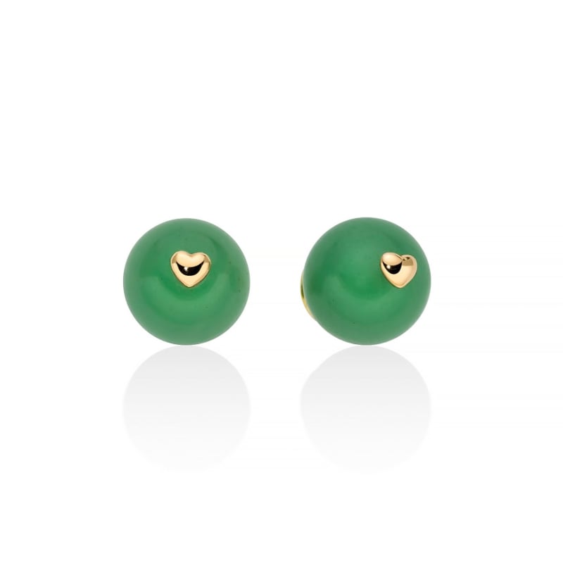 Miluna women's earrings from the I Segreti Della Natura collection. 925 silver earrings with gold PVD finish, featuring green aventurine quartz stones, 8 mm in diameter, and a 9kt rose gold heart. Screw closure. Reference: ERD3086