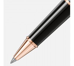 The Meisterstück Rose Gold-coated Classique collection features a design that made history. Introduced in 1924 with a name meaning "masterpiece", Meisterstück has become a symbol of luxury writing. The barrel and cap are made of black precious resin, bearing the iconic Montblanc emblem inlaid in white on the top of the cap. Roller Meisterstück Rose Gold-coated Classique.