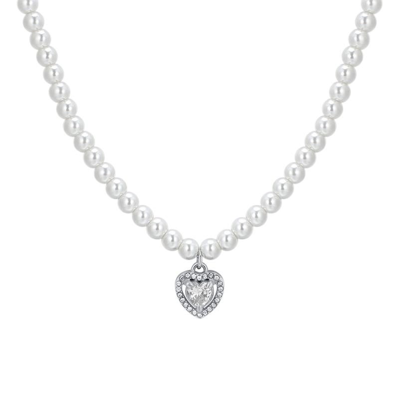 Women's steel necklace with white pearls and heart with white zircons. Length: 40 + 5 cm. Pearl size: 4 mm. Pendant size: 10 x 12 mm. The white pearls, a symbol of purity and grace, are delicately intertwined along the chain, while the heart decorated with blue and white zircons adds a touch of brilliance and love. Every detail has been carefully curated to create a jewel that embodies timeless harmony and beauty. Reference: CK2008