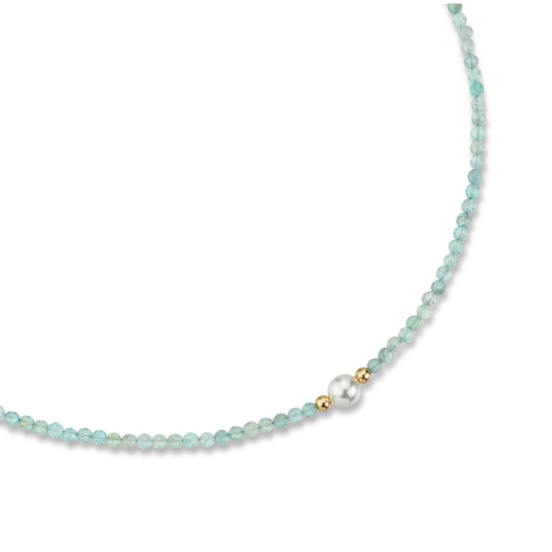 Bottega Boccadamo women's necklace from the Perla collection. 925 silver PVD gold necklace with aquamarine thread, beads, and a central pearl. Adjustable length from 37 to 43 cm. Reference: BGR154DA