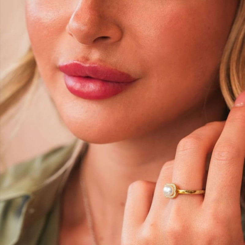 Boccadamo women's ring from the Sophie collection. 925 silver PVD gold ring with zirconia stones and a pearl, adjustable size from 13 to 19. Reference: AN542D