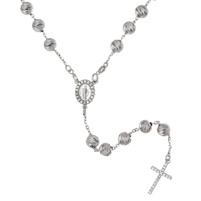 Unisex necklace in 18kt white gold. Rosary necklace with pendant and zirconia stones, length 60 cm. Diamond-cut beads, diameter 6 mm, lobster clasp closure. The necklace weighs 20.80 grams. Reference: GL102238